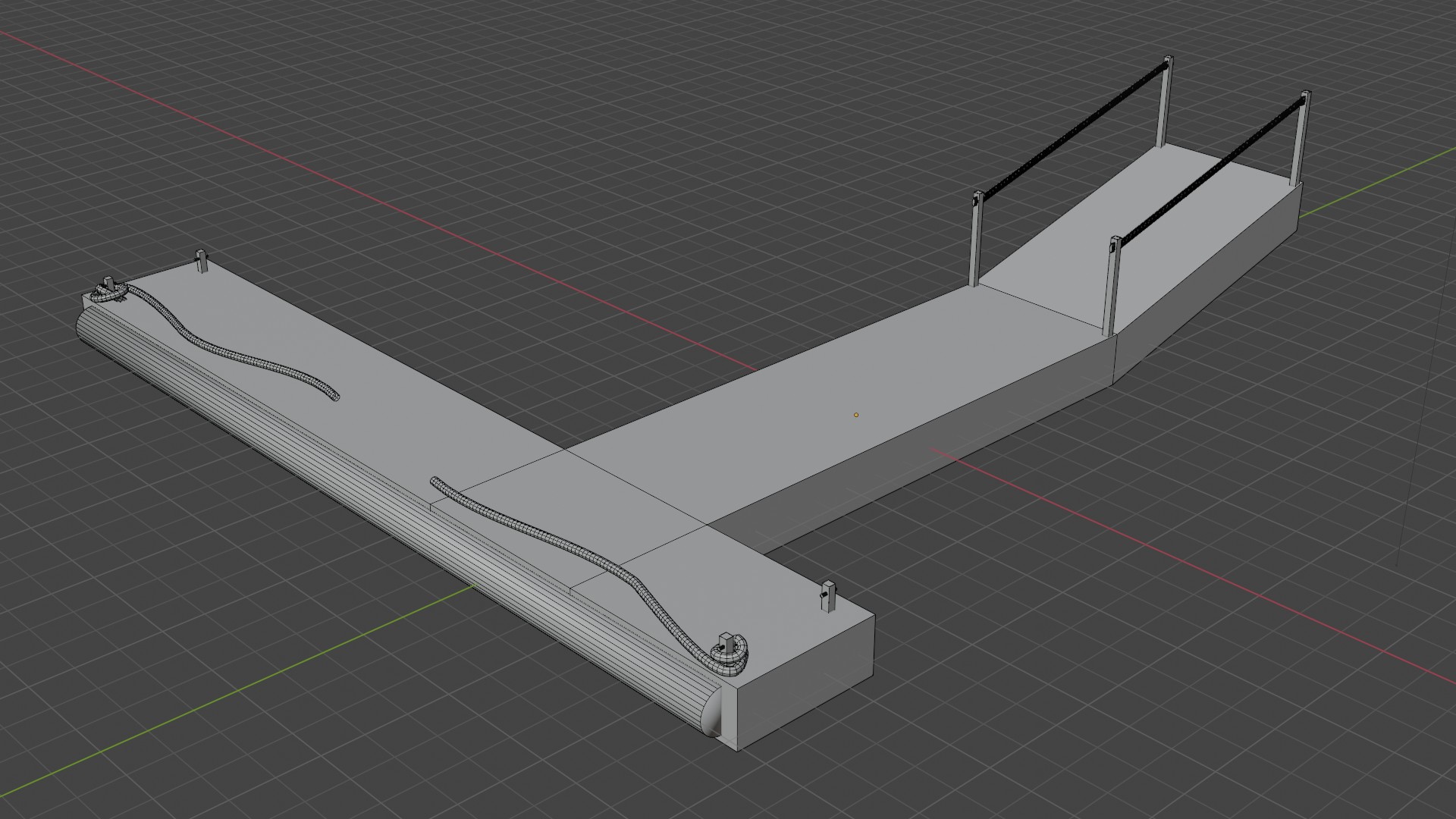 3D model of a wooden dock extending over a body of water, though the water is not visible in the scene. The dock has a dark, weathered wood texture, adding a sense of realism and suggesting exposure to outdoor elements. The main platform of the dock is wide and sturdy, featuring a thick, ribbed edge to provide additional support. A long rope is coiled neatly on one side, adding a nautical touch and enhancing the dock's practicality for mooring boats. The dock transitions into a narrower walkway with handrails on either side, creating a safe pathway. The design is simple yet functional, making it ideal for use in marina or lakeside settings. The neutral beige background emphasizes the textures and details of the wood and metal elements. This model would be suitable for architectural visualizations, environmental scenes, or tutorials focusing on creating outdoor structures with natural materials. All working files, references, animations, textures, FBX, OBJ, STL and .blend file included in zip file. Specific Model statistics in pictures. If you would like something specific or need help with any model please just email onthecouchstudio@outlook.com. Thank you.