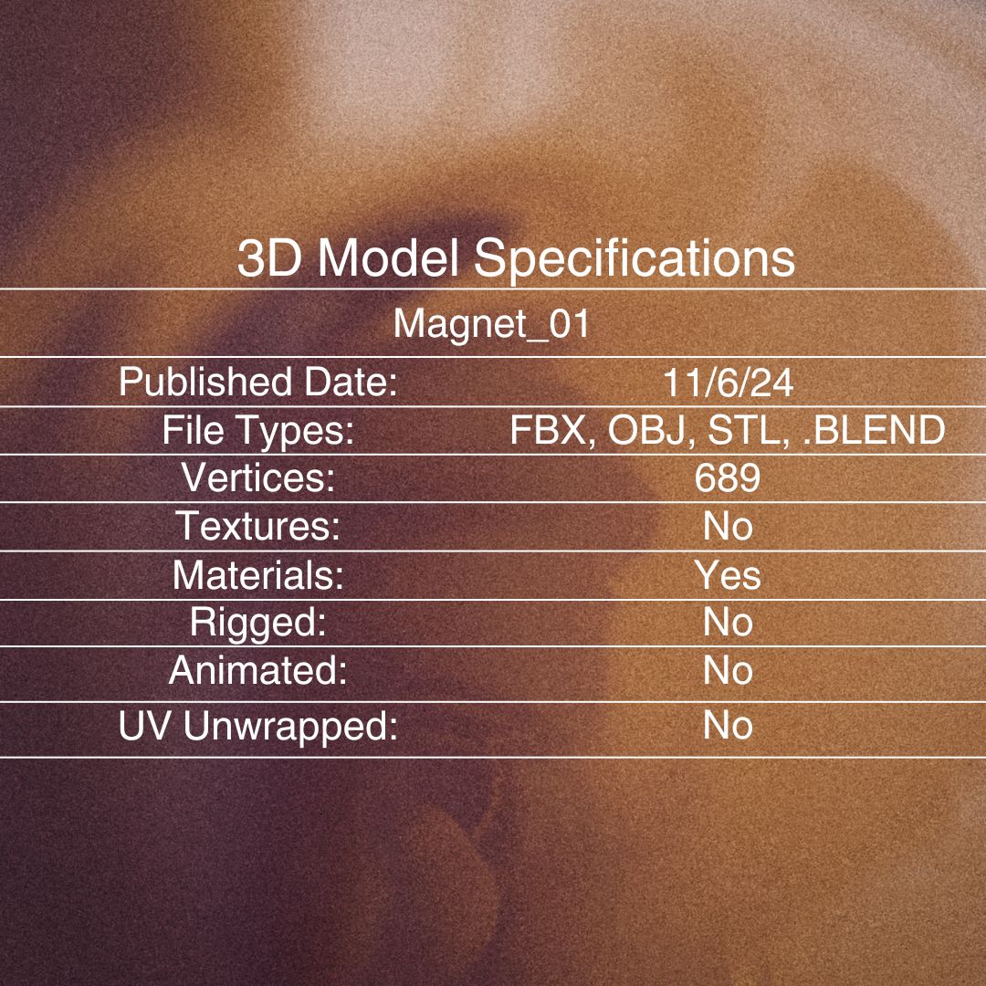 3D model of a U-shaped magnet, featuring the classic color scheme: red on one side and blue on the other, signifying the north and south poles. This type of magnet is often associated with attraction and polarity concepts, making it ideal for visuals related to magnetism, science education, or the concept of attraction in a figurative sense. All working files, references, animations, textures, FBX, OBJ, STL and .blend file included in zip file. Specific Model statistics in pictures. If you would like something specific or need help with any model please just email onthecouchstudio@outlook.com. Thank you.